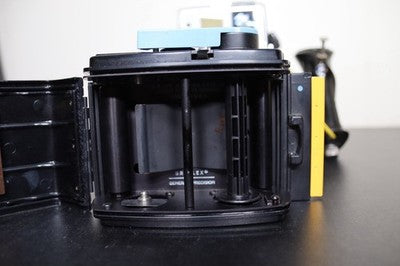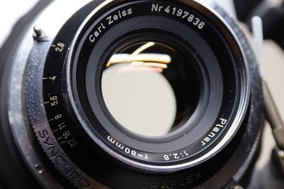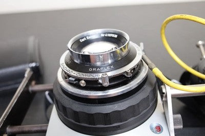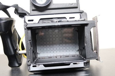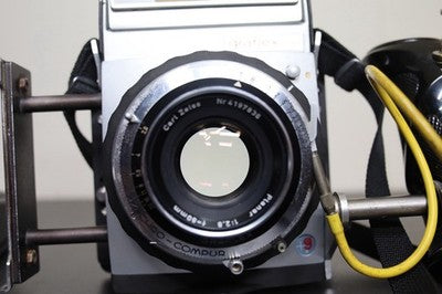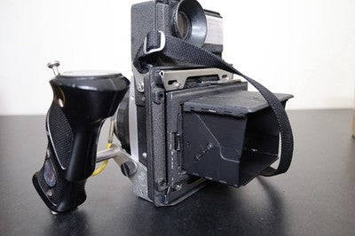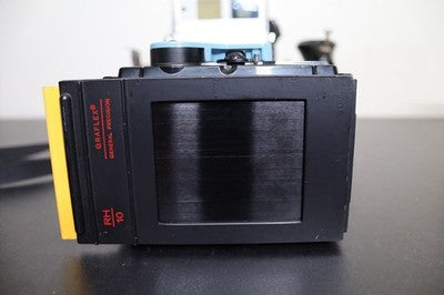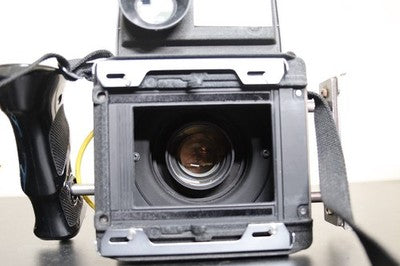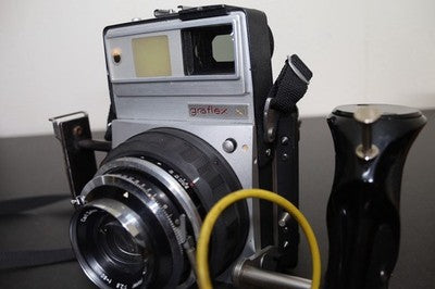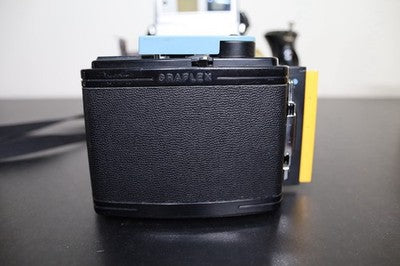 This is for a Graflex XL camera with a Carl Zeiss 80mm f2.8 Planar lens, Graflex RH10 120 film back (shoots 10 shots), the ground glass viewer back, the side mount attachment, the pistol grip with its yellow shutter release cable, range finder eye cup attachment and camera straps. Also included is the quick focusing lever that attaches around the rubber focus wheel (not pictured).
