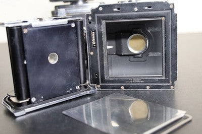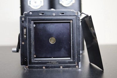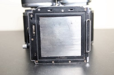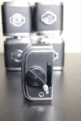 This is for a Hasselblad 12 Magazine film holder back for 120 film. This film holder works on 500 series Hasselblad bodies. This is the original version with the V button. Good overall condition, some cosmetic blemishes. Winder arm works as it should, lock mechanism locks securely and film insert fits snugly.
