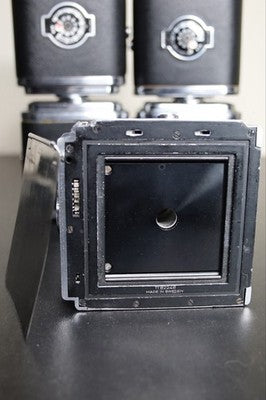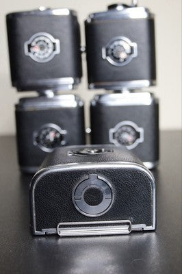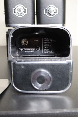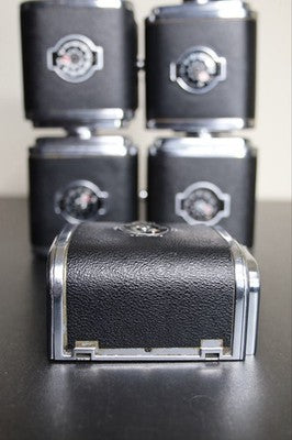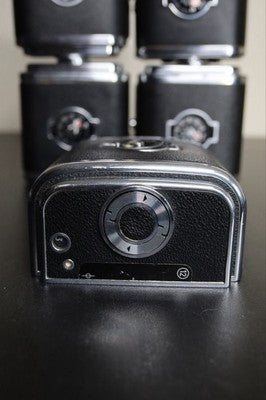 This is for a Hasselblad 12 Magazine film holder back for 120 film. This film holder works on 500 series Hasselblad bodies. This is the original version with the V button. Good overall condition, leatherette is great. some scratches on corners of chrome. Winder works as it should, lock mechanism locks securely and film insert fits snugly.