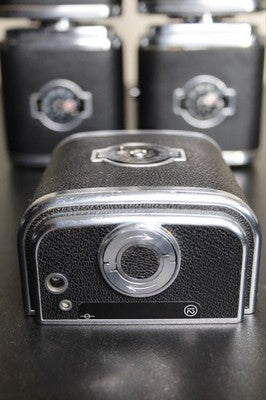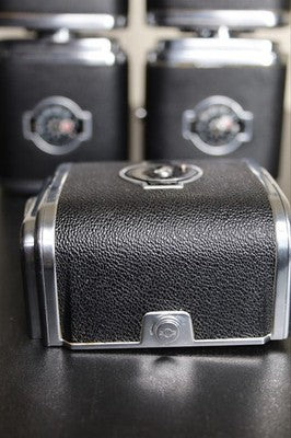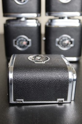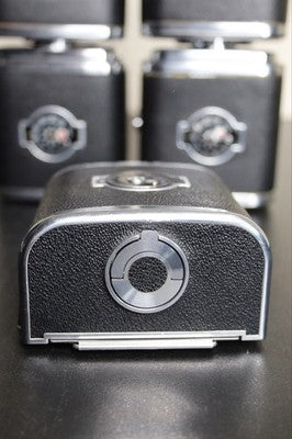 This is for a Hasselblad 12 Magazine film holder back for 120 film. This film holder works on 500 series Hasselblad bodies. This is the original version with the V button. Good overall condition. Some cosmetic scratches on corners of chrome. Winder works as it should, lock mechanism locks securely and film insert fits snugly.