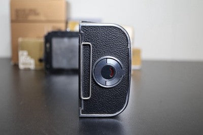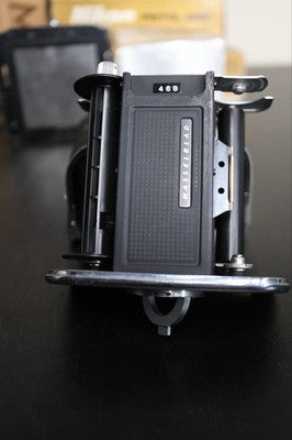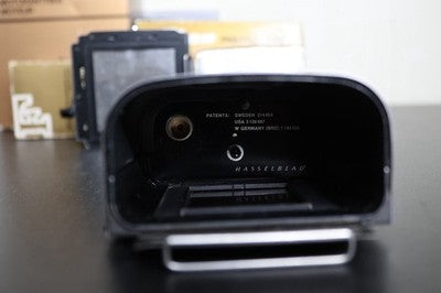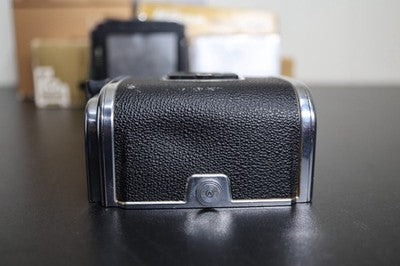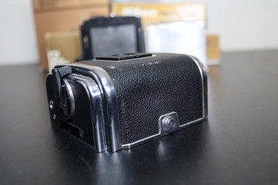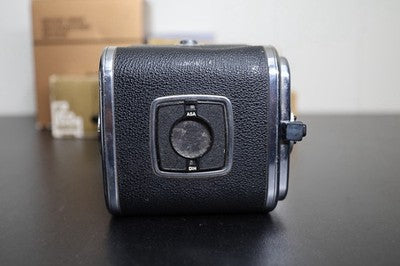 This is for a Hasselblad A16S film black for 500 series cameras. This film back shoots 16 shots of 120 film in 6x4.5 format. Overall good condition, some cosmetic blemishes on the leather. Small dent near "V" button.