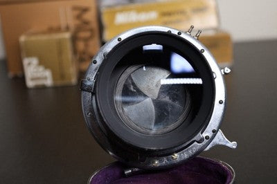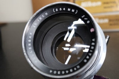 This is for a Wollensak 10 inch 254mm f6 lens with an Alphax synchromatic shutter by Wollensak Rochester U.S.A. The glass is great. Shutter speeds seem accurate. Aperture opens and closes exactly as it should. Some internal dust, some blotches on front element near one side.